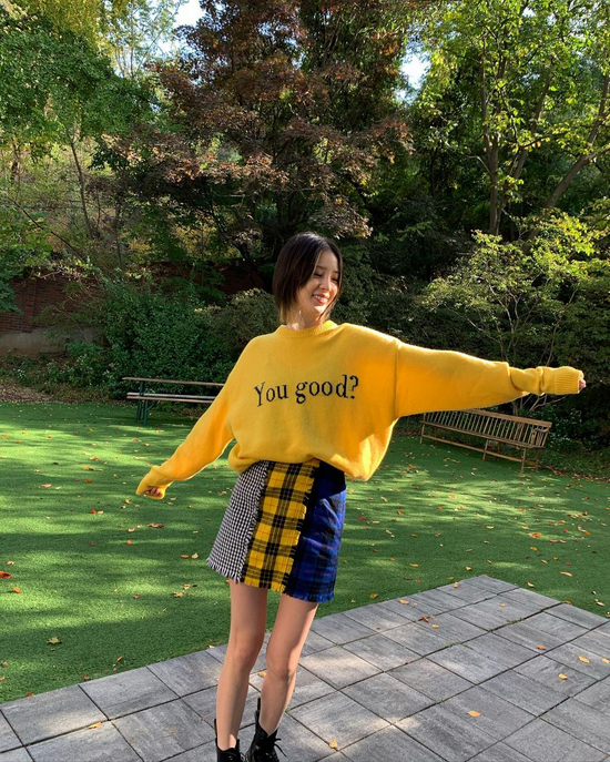 时尚博主Irene Kim一贯在配色上玩得更大胆,亮眼的黄色毛衣搭配格纹拼接短裙,满满的青春活力感之余,更有时尚博主的“大胆”。