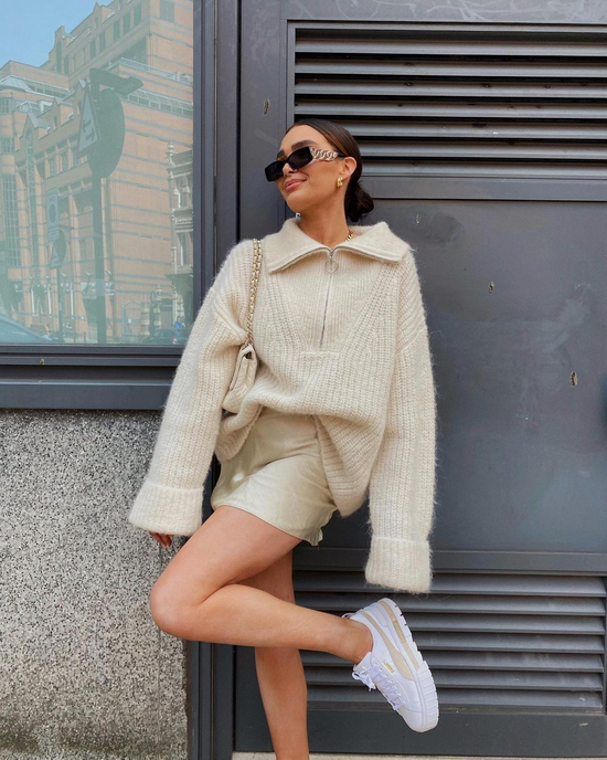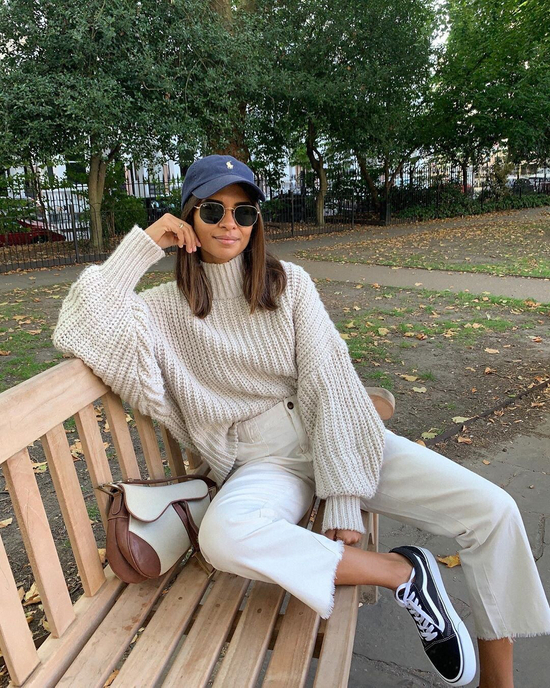 秋冬季节最应景的单品应该就是白色系的毛衣了,它的搭配融合度非常高,而且在黄棕色调为主的秋天,这个颜色也能完美融合入秋色之中。