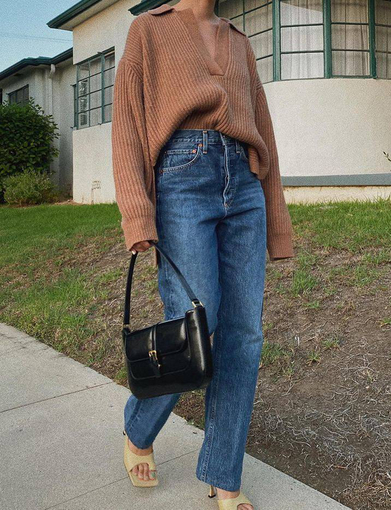 还有今年大热的翻领设计毛衣也是可冲的款式,搭配直筒牛仔裤,整体造型没有过于复杂的装饰,是“简约主义者”的菜!
