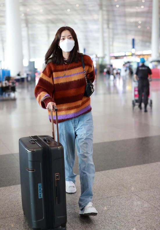 表姐刘雯用海马毛彩色条纹毛衣搭配一条Baggy牛仔裤,舒舒服服又很好看(Tips: 这季的彩色条纹毛衣是个流行趋势)。