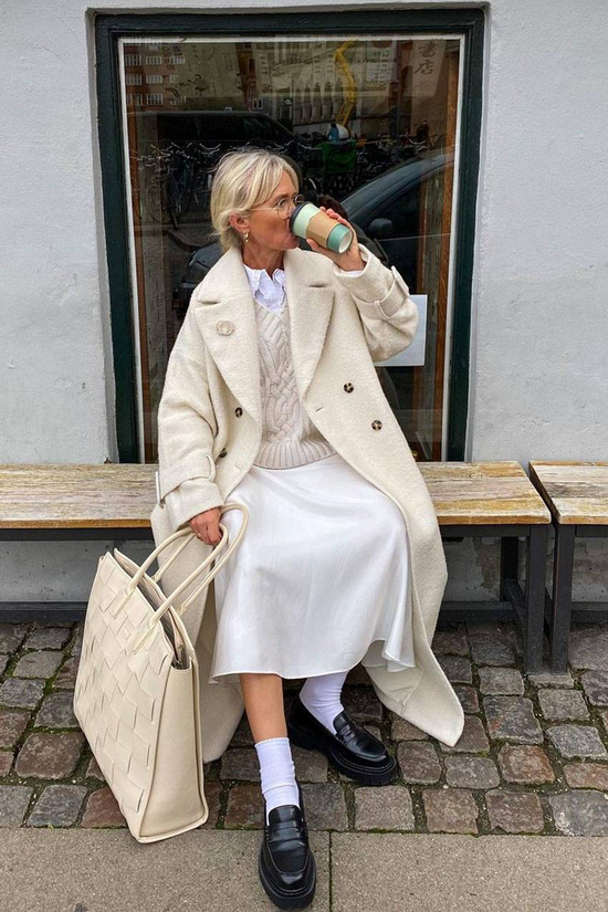 经受不住寒冷天气的报友们可以忽略短裙,长裙搭配毛衣也是很🉑️的,再套上一件大衣,而且你发现了么,这个搭配法其实没有什么年龄限制的,可以在颜色上做做文章,比如整身偏质感挂的奶油色系,更适合年龄稍微大一点的来穿~