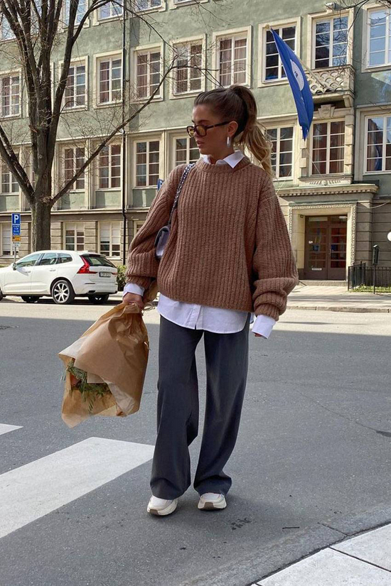 宽松的Oversize版型毛衣套装可能对身材不那么友好,但是拍照时凹凹造型还是可以的。