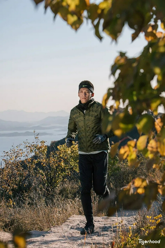 在经过一系列的拉伸和小跑热身之后,我准备开启今天的越野跑之旅。因为山上的天气非常多变,所以在整个跑步的过程中我换上了 Nike FIT ADV 系列,主打的这款 Nike Therma-FIT ADV Repel Jacket 羽绒跑步夹克。