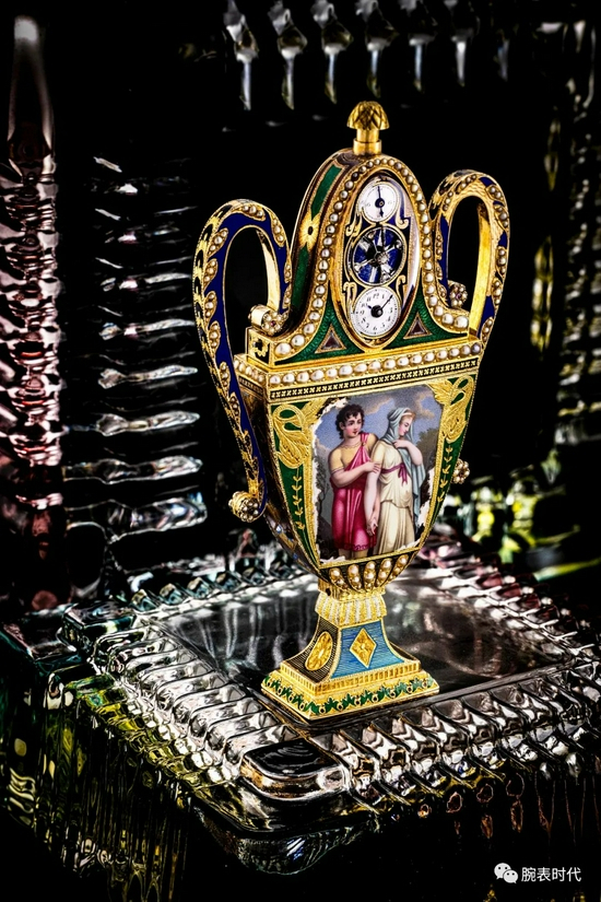 同场亦推出一枚18K金珐琅彩绘镶珍珠双耳瓶,配八音盒、香水库、活动人偶及时钟,相信由一代巨匠Piguet & Capt约于1805年为中国权贵制作,据知与这枚双耳瓶为一对的另一枚双耳瓶,现由百达翡丽博物馆珍藏及展出。