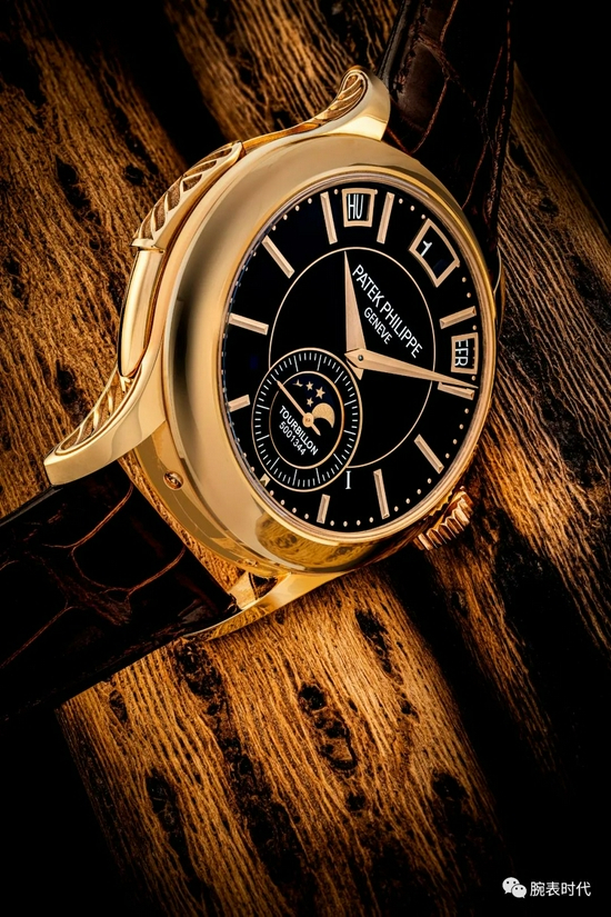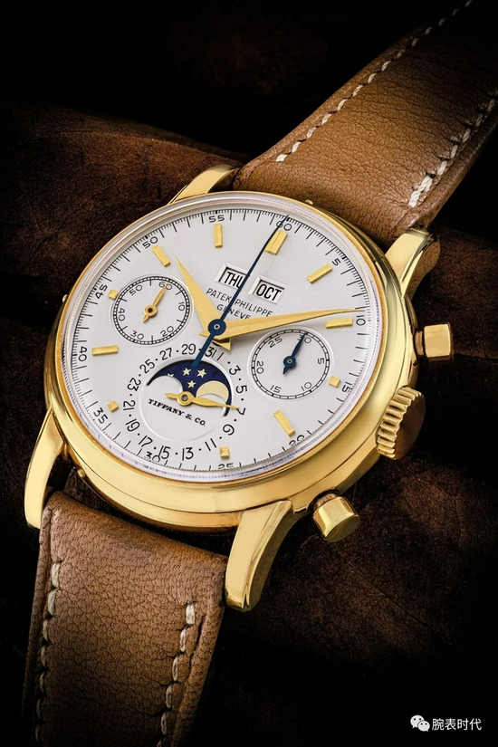 18K黄金万年历计时腕表,配月相显示,由蒂芙尼销售,