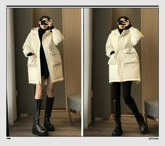中长款羽绒服无论是颜值,还是保暖性都是很高的,它也最受女性欢迎。在穿它的时候一定要有腰线,优化身材比例不就是显瘦嘛。