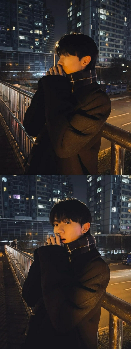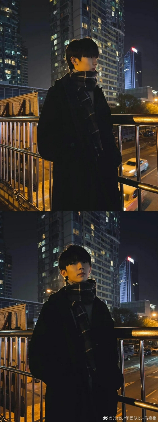 出生在冬天的马嘉祺似乎总是自带清冷的氛围感,夜晚路灯的照耀下身穿ADLV黑色大衣外套,搭配格纹围巾,韩剧浪漫氛围立马拉满。
