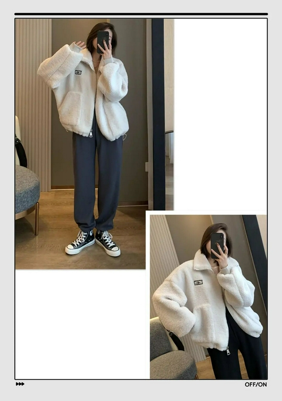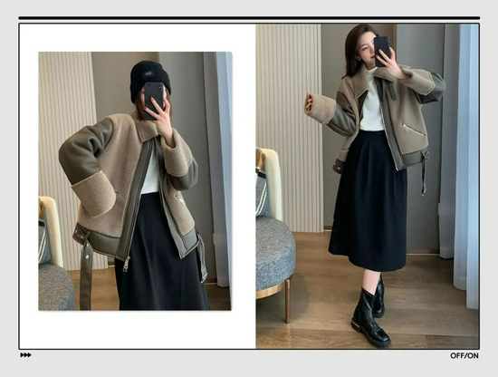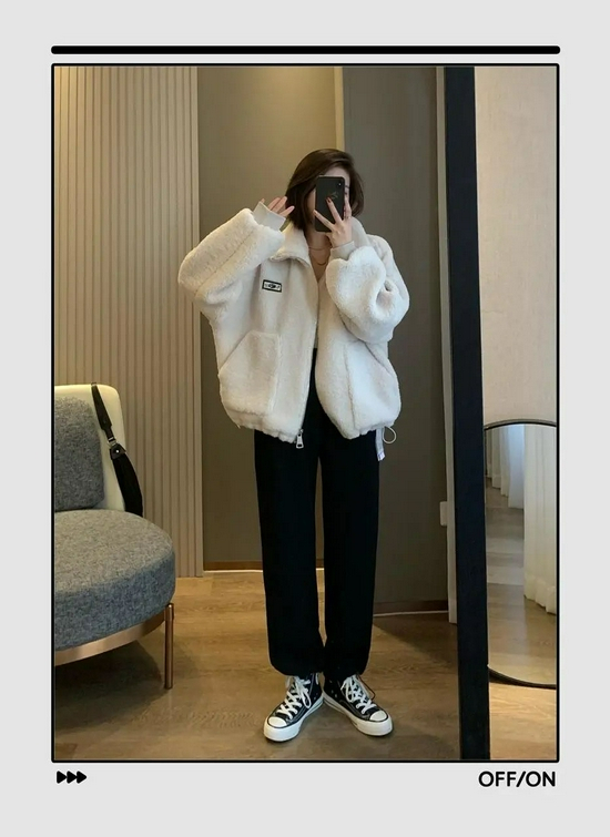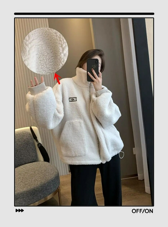 这件羊羔毛机车服属于男友风,宽松的廓形,并不是oversize款不会显胖哦。里面加了棉又轻又保暖,南方穿它过冬不成问题。