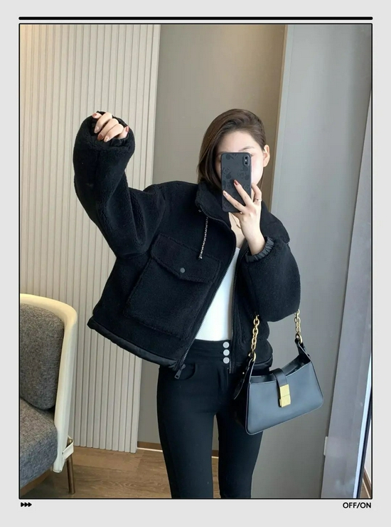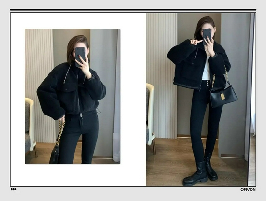 这件羊羔毛外套它内里加入了菱格夹棉,保暖锁温的效果绝了,而且是一件小短款哦,搭配紧身裤穿,显高显腿长效果真好。