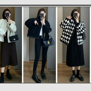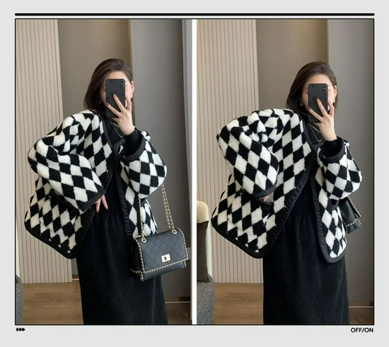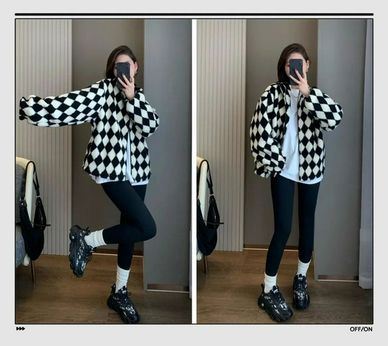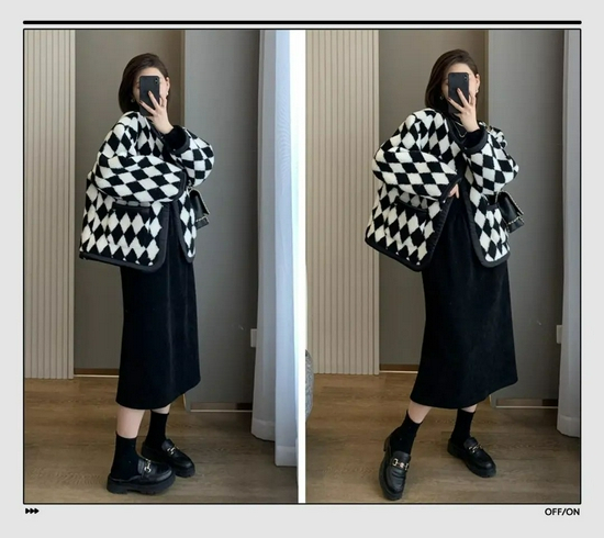 又是一件棋盘格的羊羔毛外套,和上一件不同的地方是拥有黑色包边,也拥有了更好的质感,是敞开穿的款式。