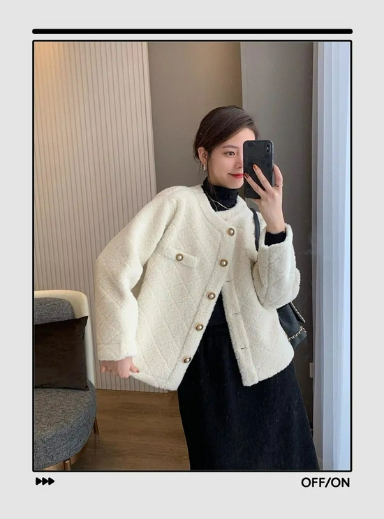 小香风的羊羔毛外套你入手了吗?它的长度和宽松度都很不错,属于搭对下装显瘦显高的存在。