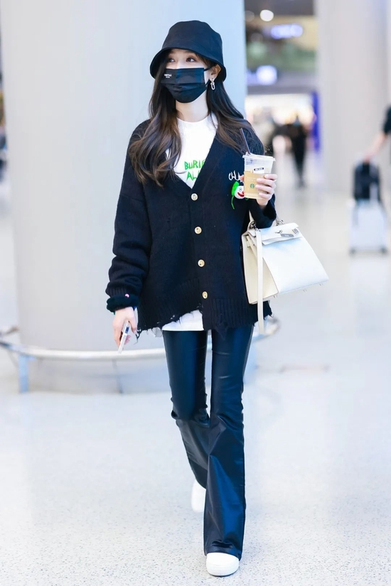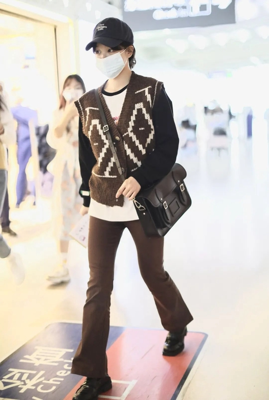 徐梦洁上身的这条棕色喇叭裤,可以说复古气质很强了。搭配针织背心和剑桥包,学院风也能打造得不失高级感。