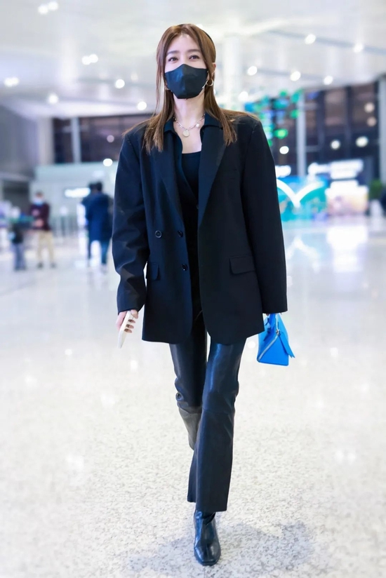 喇叭裤里比较好驾驭的,要数秦岚上身的这条九分裤型,在让腿看起来很直的同时,还可以露出整个腿部最细的位置,衔接一双皮质短靴,整个人看起来利落又很大气。