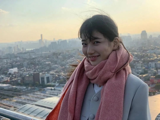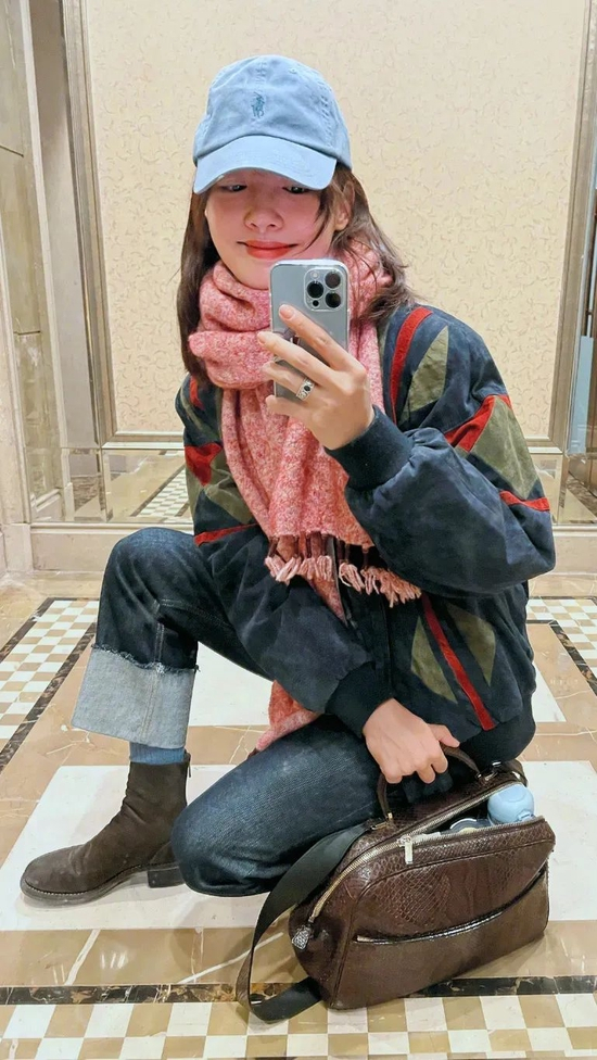 最近持续营业的白百何,选用粉色针织围巾搭配工装风 look,丝毫不装嫩,意外地好看。