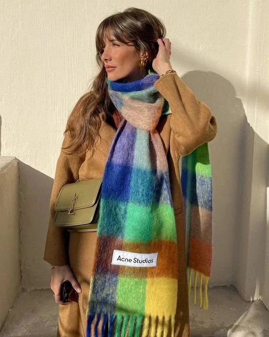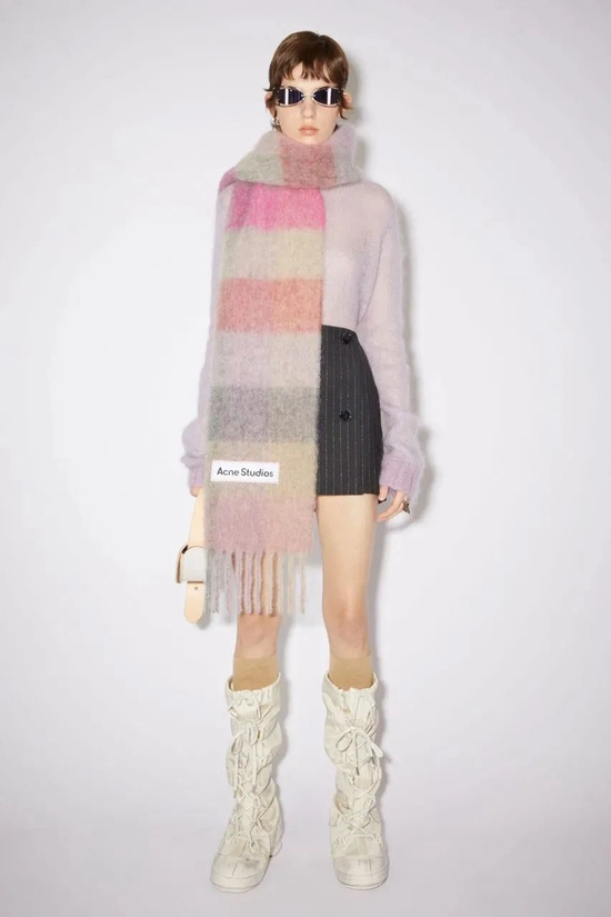 从去年冬天开始,具有少女感的粉彩色围巾,就开始成为街头一道靓丽的风景线。带火这股彩色围巾潮流的,是来自瑞典的品牌Acne Studios。