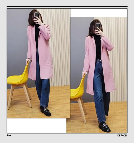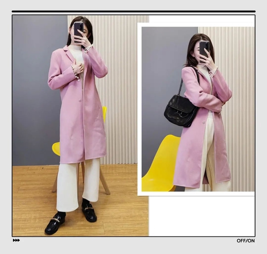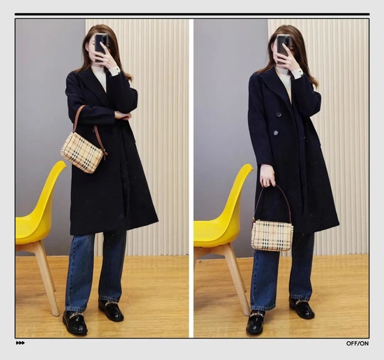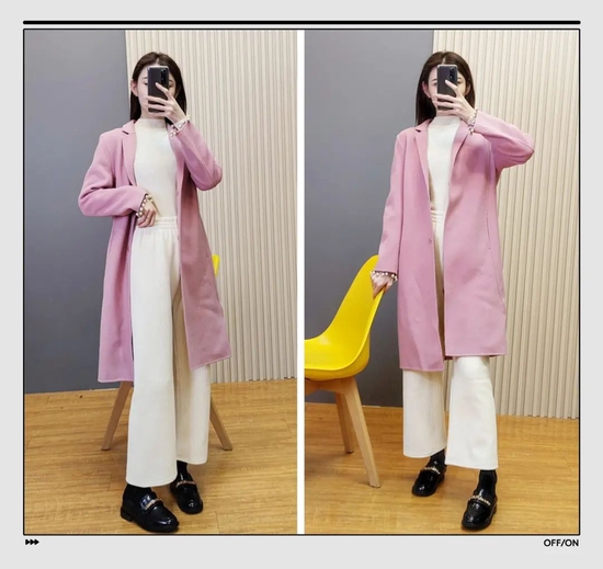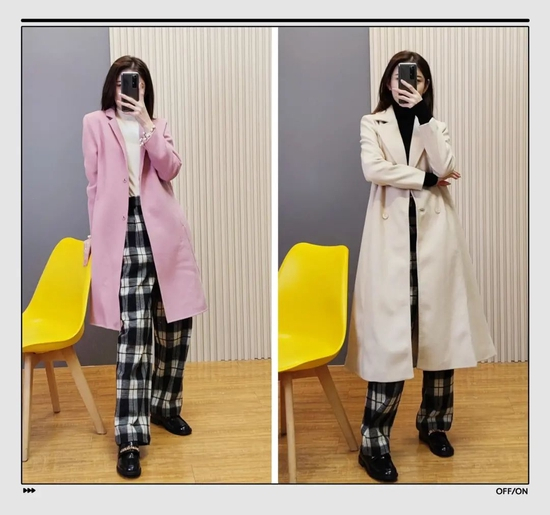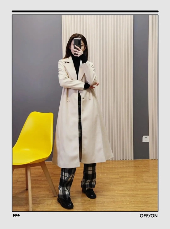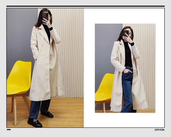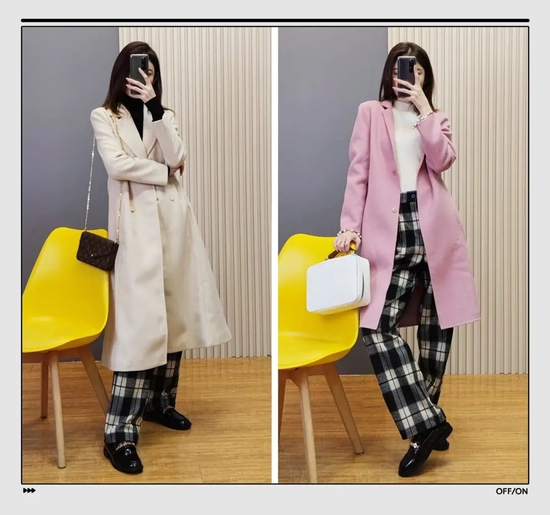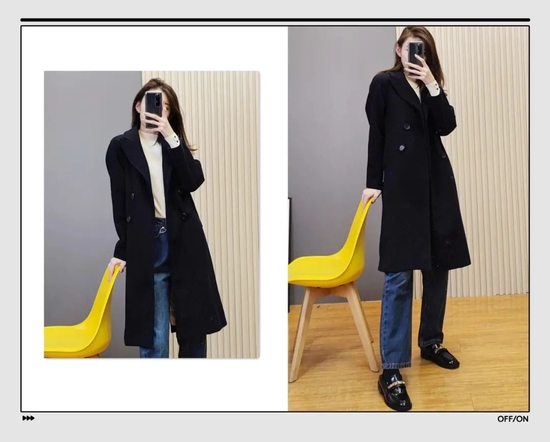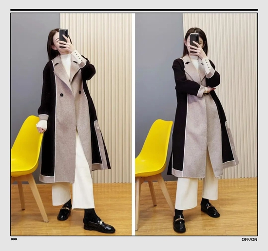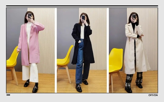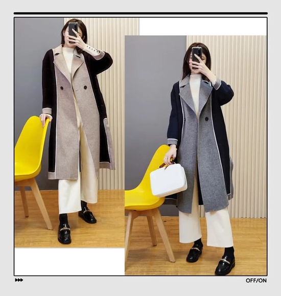 大家在日常穿衣时要注意线条感,比如这件拼色大衣,两个颜色拼接的间隙,就是一条直线,是显高显瘦的关键。