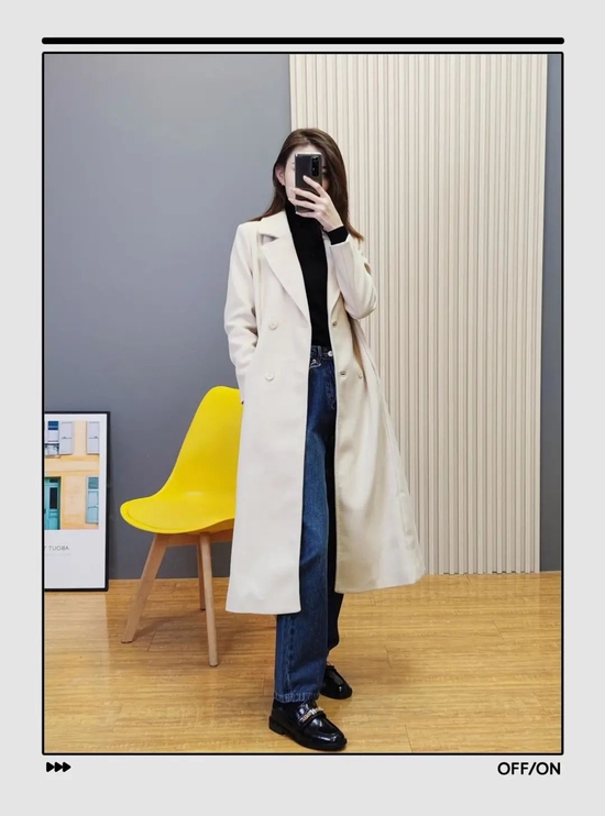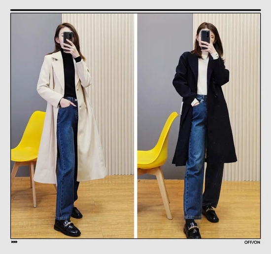 牛仔阔腿裤在搭配这种深色大衣时,尽量穿一件浅色内搭,能轻松赶走沉闷感,更显活力。