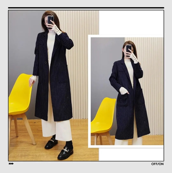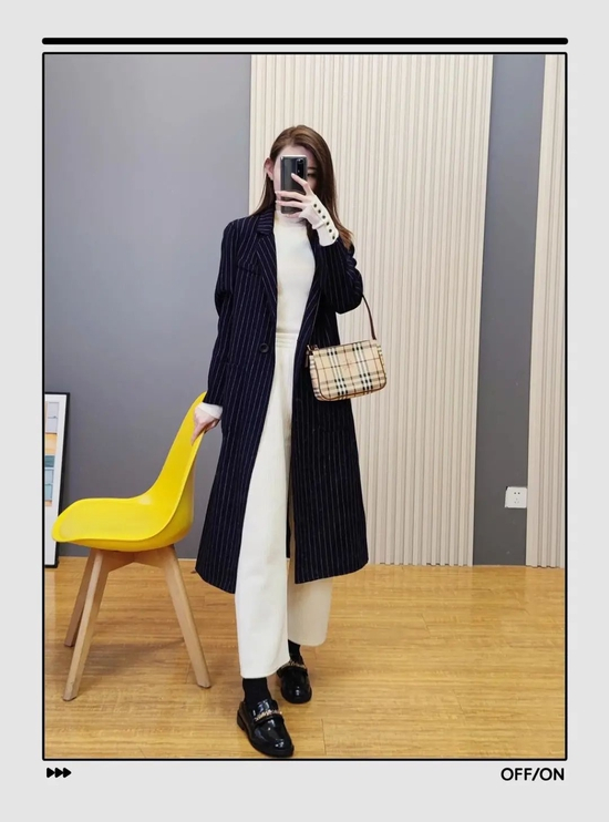 除了拼色大衣的显瘦效果最佳外,条纹大衣丝毫不弱,在拉长身材线条这一点上会更胜一筹。