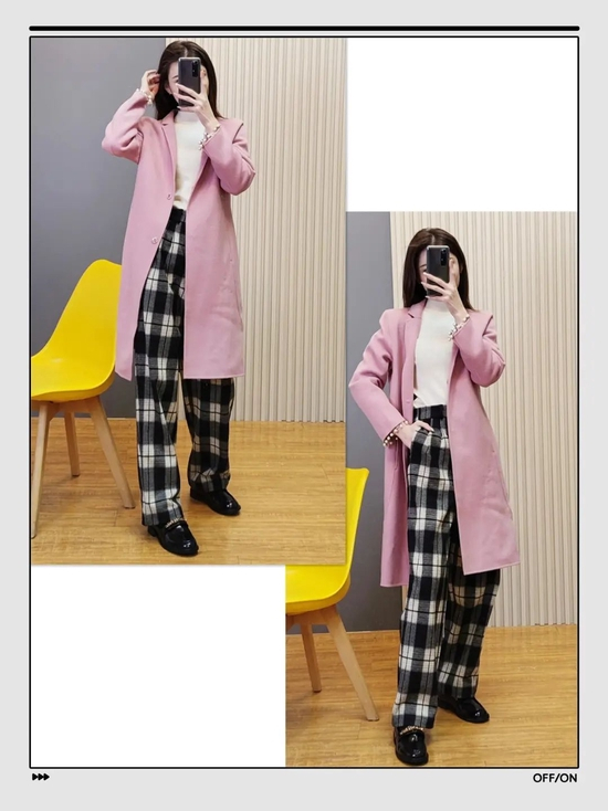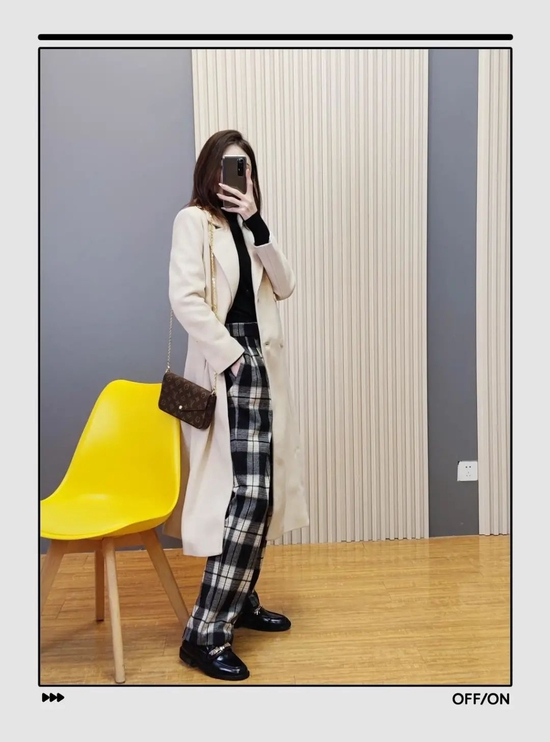 一件浅色大衣混搭灰白格子阔腿裤,感觉软妹子也能一秒变身酷girl~