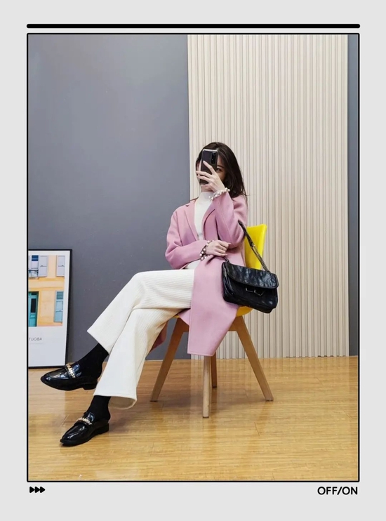 白色阔腿裤与浅色大衣搭配比较不容易出错。我穿的白+粉的组合,很显青春活力。在大衣袖口还有一圈珍珠点缀,灵动十足。
