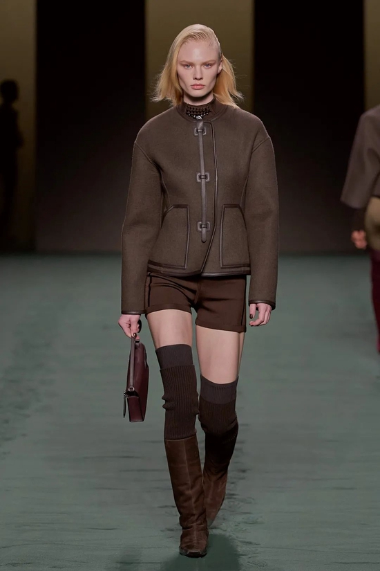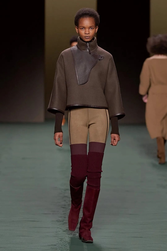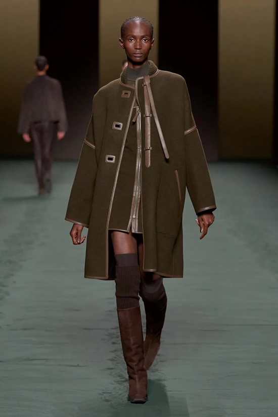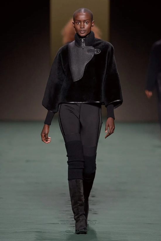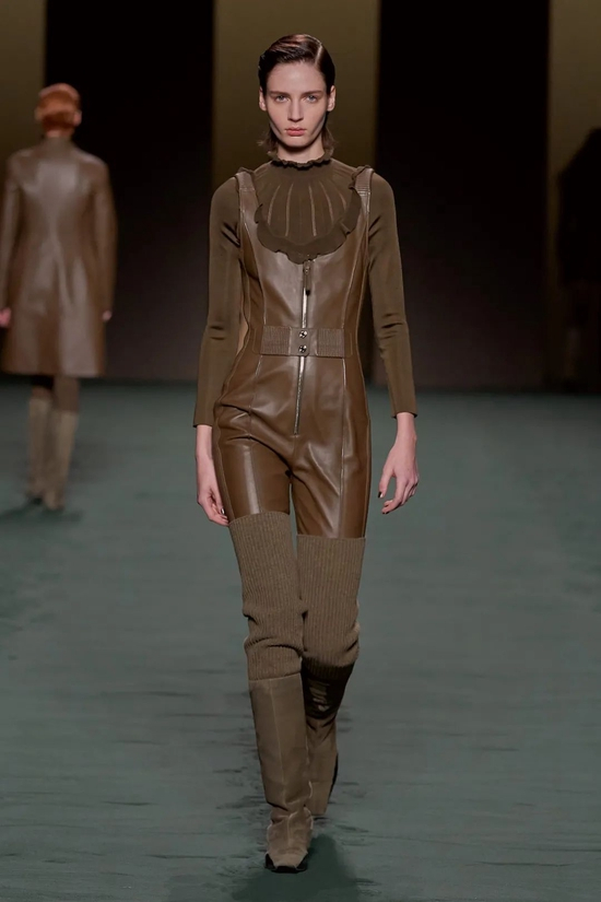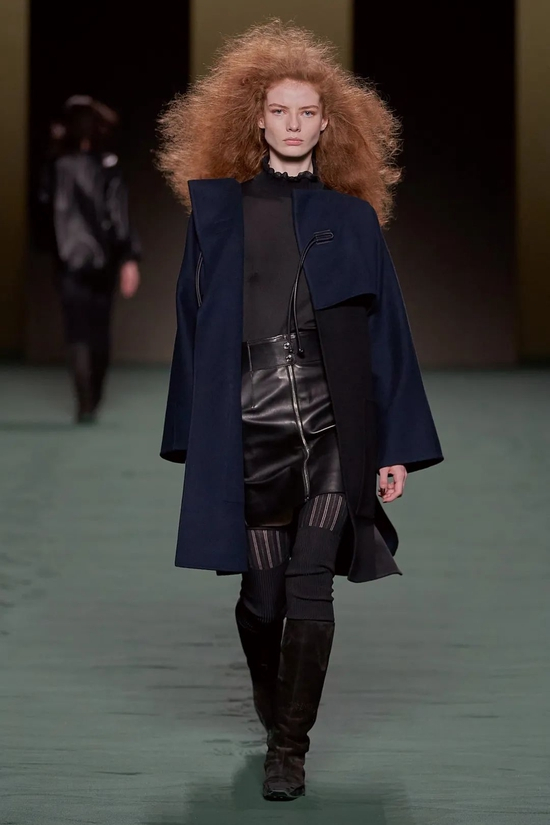 所以我们看到了简约的亚光黑色皮革拉链夹克;廓形隽永的白色和棕色大衣;将Loden羊毛与皮革镶板和滚边混合的外套;青绿、湖蓝、米白色系轮番上演。年龄、阶级、性别…与世俗背道而驰又如何?厌倦了千篇一律的循规蹈矩,无畏面对旧识,打破常规,这是自由的爱马仕女人,沿着一往无前的道路前进,不耽于眼下,不留恋过往。