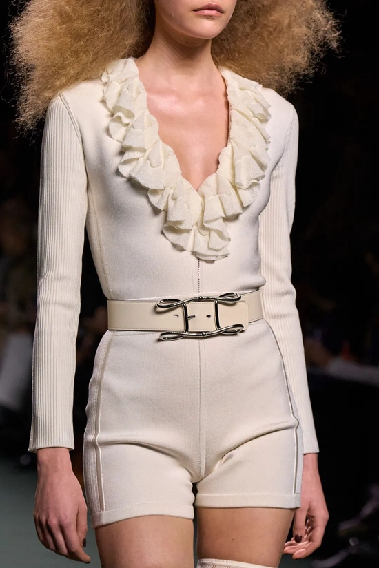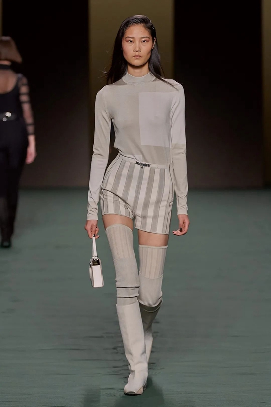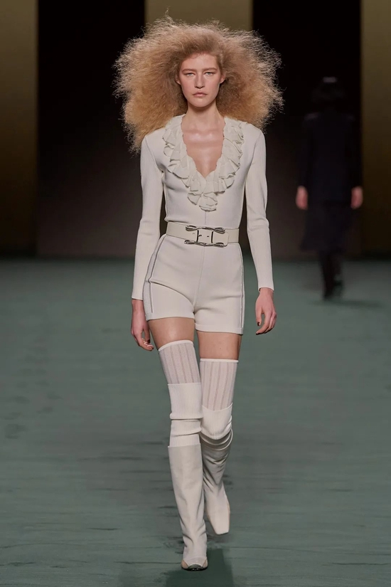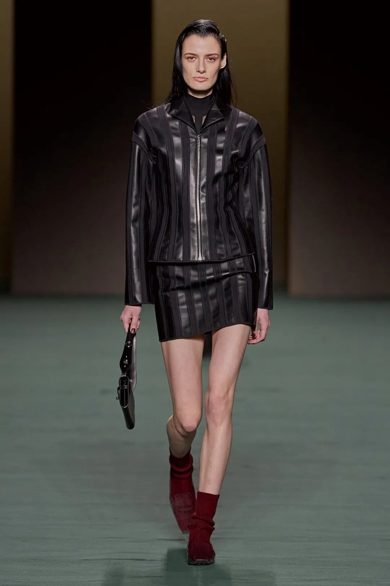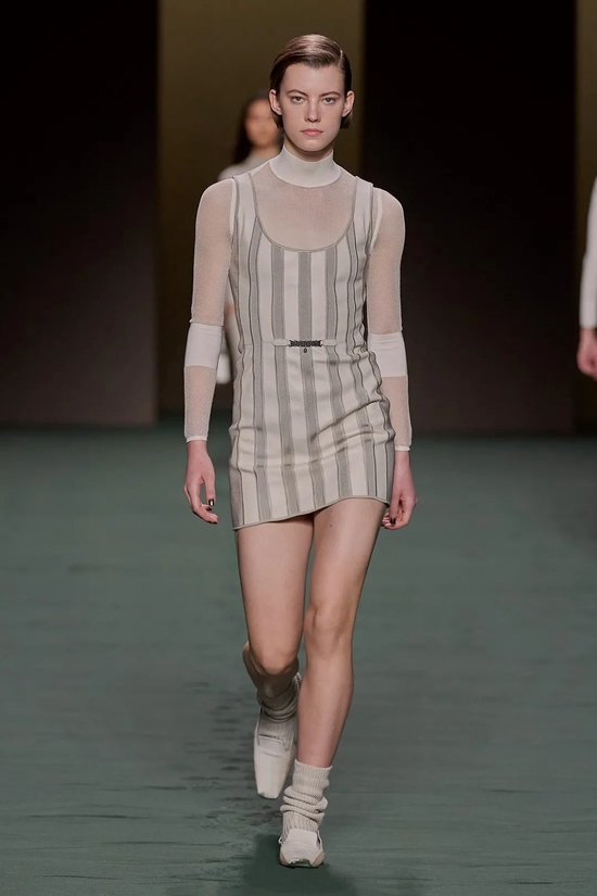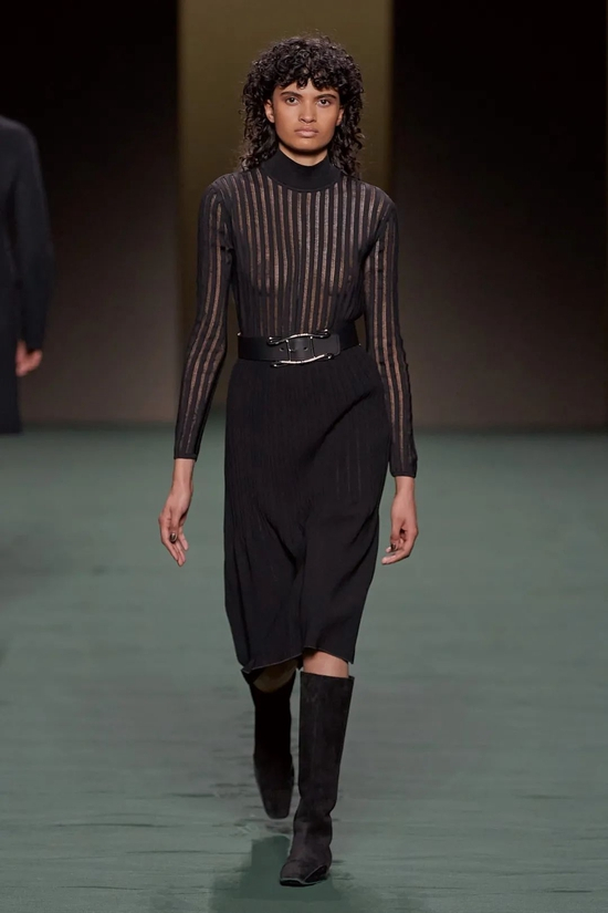 Nadège Vanhee-Cybulski以她自己的方式加入了来自美国、欧洲和中国的新一代女性设计师对于展现女性身体、肌肤主题的女性视角。“我想对当下发生的事情有一个严谨的表达,超越马术,”她说。“这真的是关于你如何将古典主义、精致和时尚转化为女性真正想展现女性气质的想法?事实上,性是好的。这不是什么可耻的事情。”在她的手中,紧身短裤搭以高筒靴和透视丝袜,针织连体衣和紧身皮革在透明与不透明间徘徊,垂直的皮革条带与半透明的蕾丝镶片相互连接。