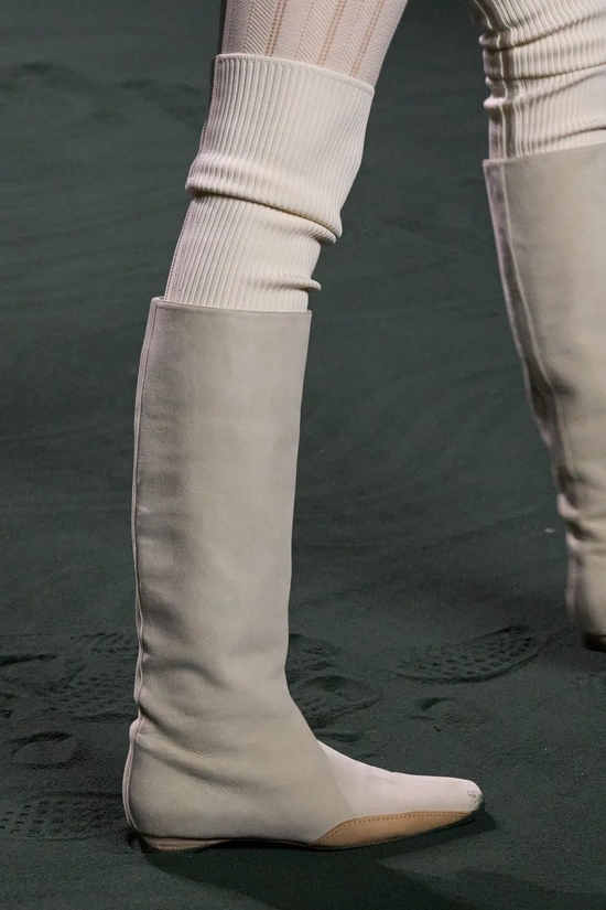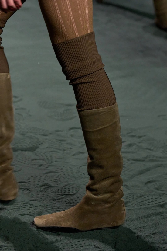 包包配饰方面,加长了手柄的手袋方便手拎和肩挎,宽腰带上点缀了银质的铃铛细节,改良于马靴的麂皮高筒靴柔软而舒适。