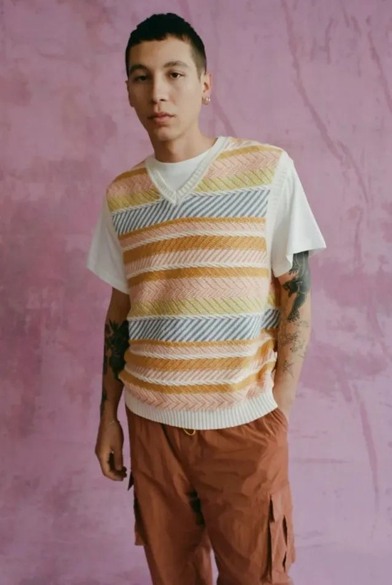 如今,毛衣背心回归唤起了三重趋势:一定程度的性别中立,同时迎合了嬉皮士复兴运动以及学院预科生风格。