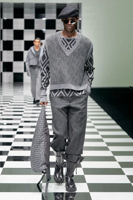 Emporio Armani 2022 秋冬系列将魅力的概念回归本源,在秀场上将灰色基调混搭不同织物图案,制作出简约现代的毛衣背心,尽显摩登浪漫。