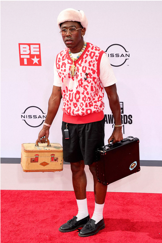 当这股趋势开始蔓延开之后,越来越多名人加入其中。首先是 Tyler, the Creator 为其品牌 Golf Wang 打造了缤纷色彩的趣味毛衣背心,他不仅亲自示范了短裤休闲搭配,还以此造型出席各大场合。