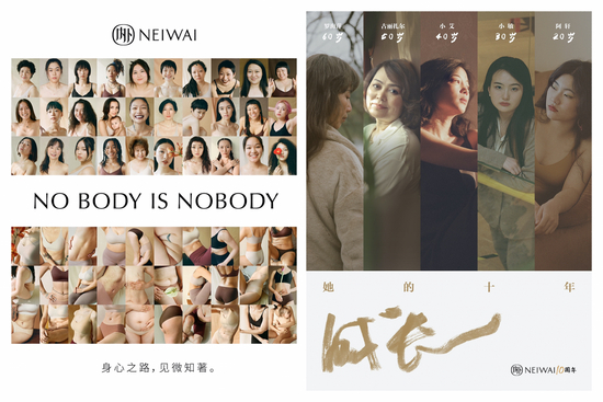 于内,伴随着‘NO BODY IS NOBODY’年度品牌项目第3季‘身心之路,见微知著’,NEIWAI内外正式开启品牌10周年。通过记录30位女性真实的身体和勇敢的心,品牌继续深入探索女性多元真实之美,以平等对视、真诚对话,会聚形成永恒更新中的中国当代女性群像,不断探讨并呈现女性的自我认同与集体力量。与此同时,NEIWAI内外上线纪录短片《成长》,邀请了5位分别在人生20、30、40、50、60岁阶段的品牌用户,来讲述她们过去十年的身心之路,在更细微、也更为开阔与深入的维度,叙述中国当代女性的觉醒、成长与思考之路。