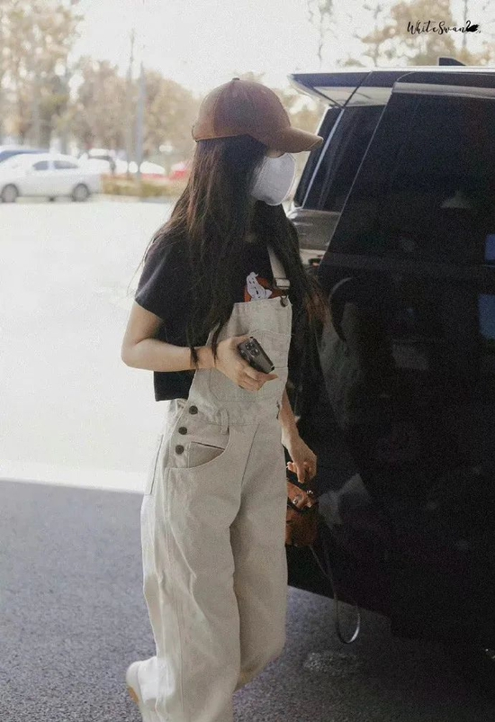 Angelababy 官宣离婚之后状态越发好了,Brandy Melville 捉鬼敢死队宽松短 Tee 搭配同品牌白色牛仔背带裤,和 New Era 棒球帽,是美式校园辣妹吧!
