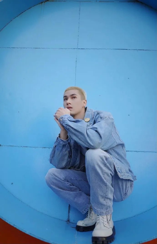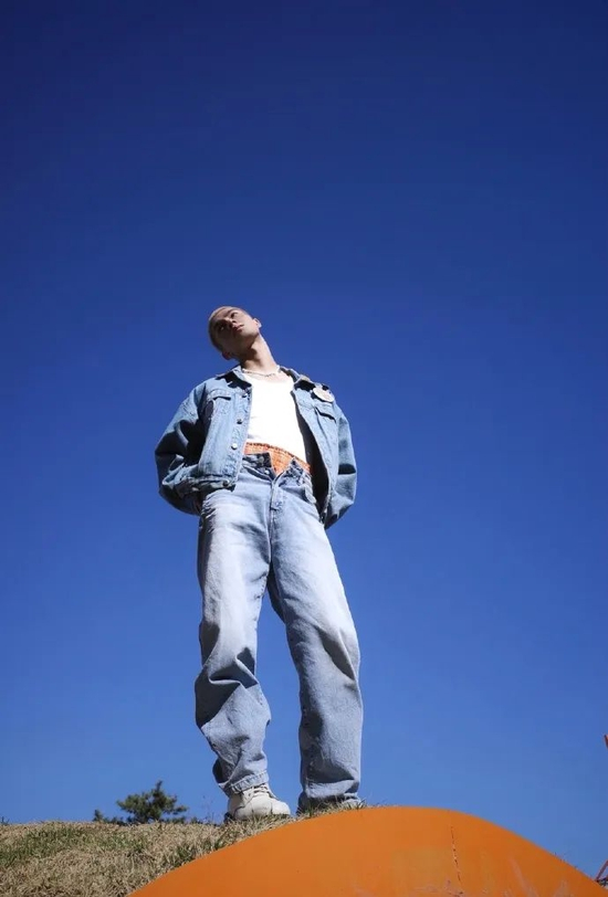 金发圆寸男孩米卡的牛仔穿搭,是与背景的蓝天一样清爽的寸头大男孩!身穿 Acne Studios 2022春夏丹宁系列套装,胸口的可爱徽章增添复古趣味,仔细看会发现小咪不仅和韩国女爱豆们一样选择了不扣裤子纽扣慵懒性感的穿着方式,还内搭了同样来自 Acne Studios 的黄色格纹半裙,无性别时尚狠狠拿捏!