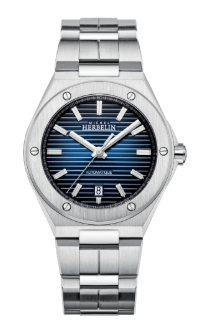 赫柏林蔚蓝海岸系列简约大气的表盘设计,给人正直刚毅的感觉。表盘雕刻甲板纹,表圈还有六颗螺钉,长条形的刻度和指针,优雅又不失科技感,各种场合都能轻松驾驭。