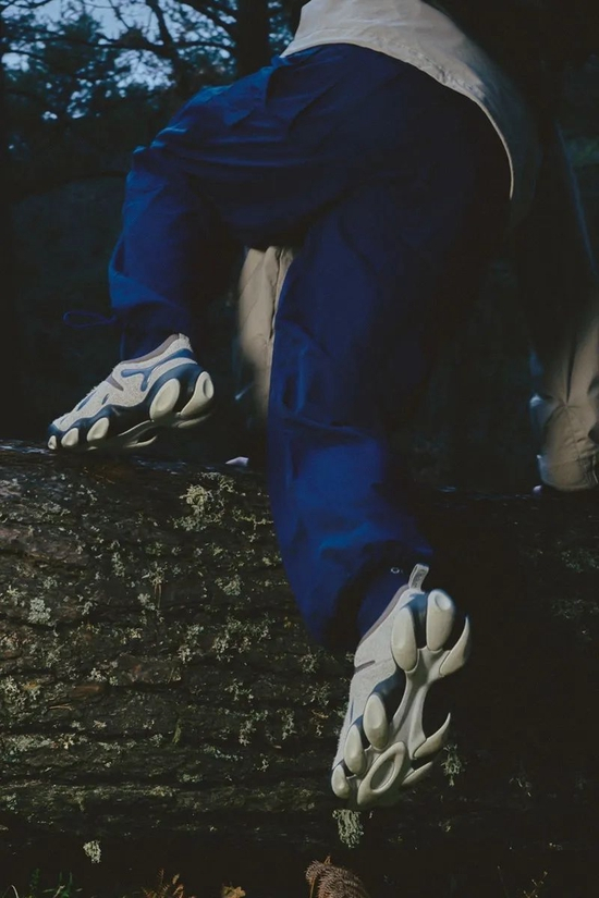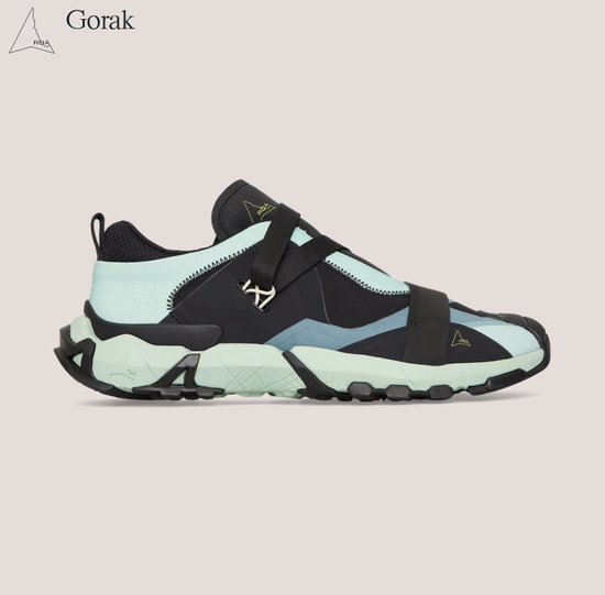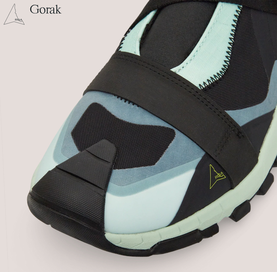 比如 Gorak。相比于 Katharina 等主打靴款,Gorak 乍一看更偏向于现代科技跑鞋的轮廓,甚至带有一些 Y-3 的韵味。其显著的特点在于采用了 laceless 式设计,靠一条环绕于鞋身的尼龙织带提供包裹性。鞋面主要采用覆面织物和工程网眼等材质打造,结合热熔工艺和各个部分的补强加固以提供相应的保护,宽大的 Vibram 鞋底仍然有着强烈的户外越野风格。