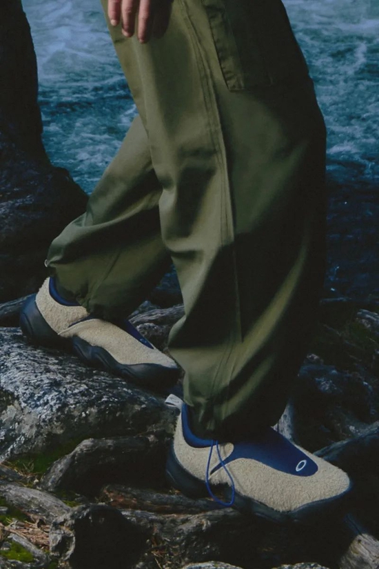 回归正题,作为 Oakley Factory Team 首次推出的产品,双方选择以前者在千禧年期间推出的最为经典的 Flesh 为蓝本,并且几乎完全保留了它最具特色的部分,包括 laceless 式设计、整体的线条感,以及通过 3D 数字渲染而成的夸张大底造型。