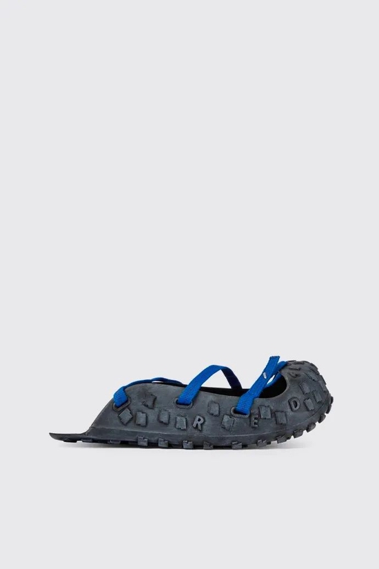 去年 6 月,CAMPER 与 ADER ERROR 的合作系列中包含了一款可拆卸外底配件,黑色橡胶鞋底与蓝色绑带的结合极大增强了视觉吸引力,橡胶的凸起像轮胎一样粗犷。只需踩入后将绑带套在鞋跟上便能‘换装完成’,即便穿着最普通的小白鞋也能一秒变身时装精,甚至与当下大火的 BALENCIAGA 轮胎鞋有着异曲同工之妙。