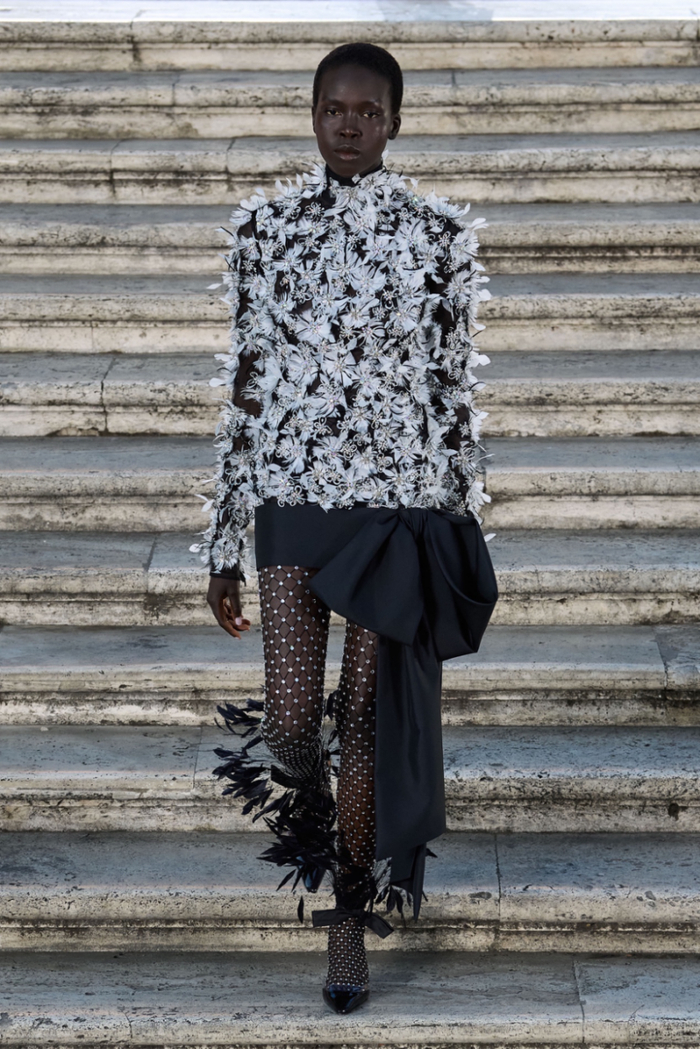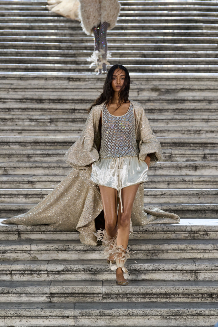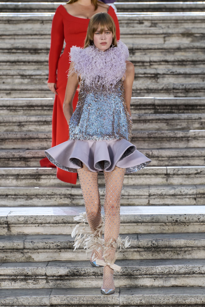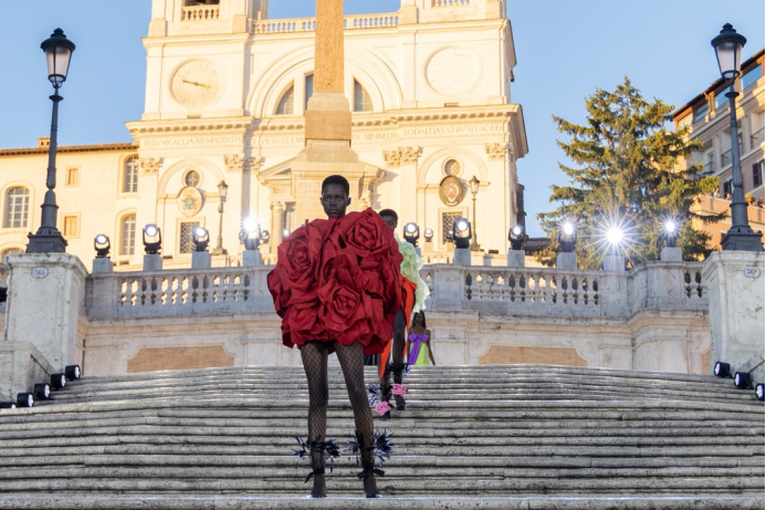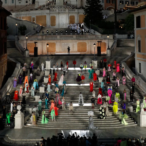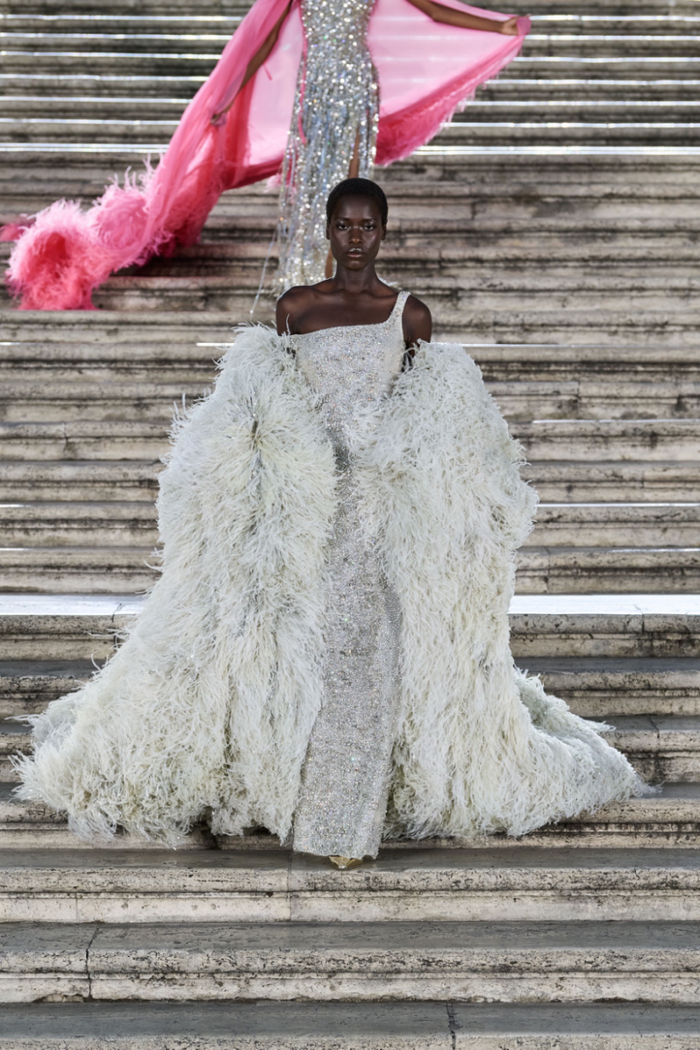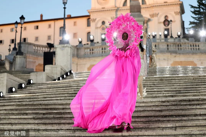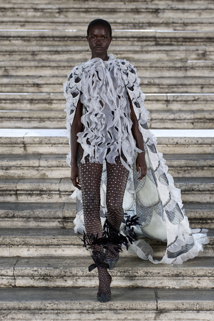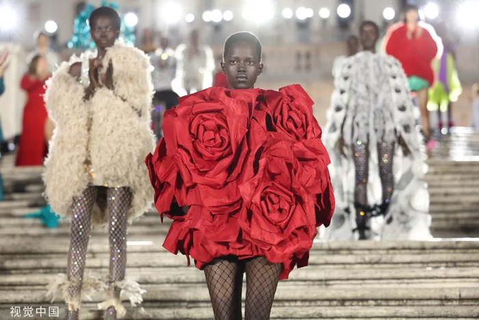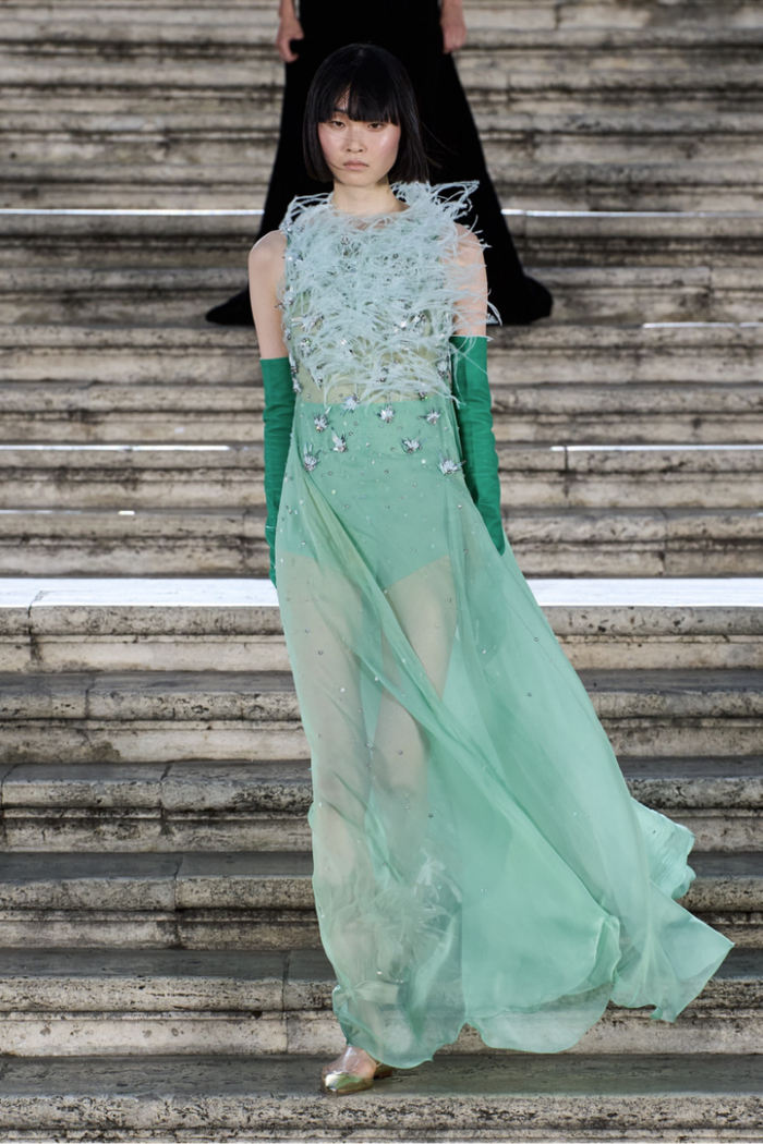 沿着西班牙广场具有历史感的楼梯,时代的步伐与秀场的步调相呼应。这些呼应都已成为 Valentino高定工坊的延伸,对美的最终描述应该与最初的诠释相仿,而非完全一致。二者之间的区别折射出对新起点的期待以及对未来旅程的憧憬。