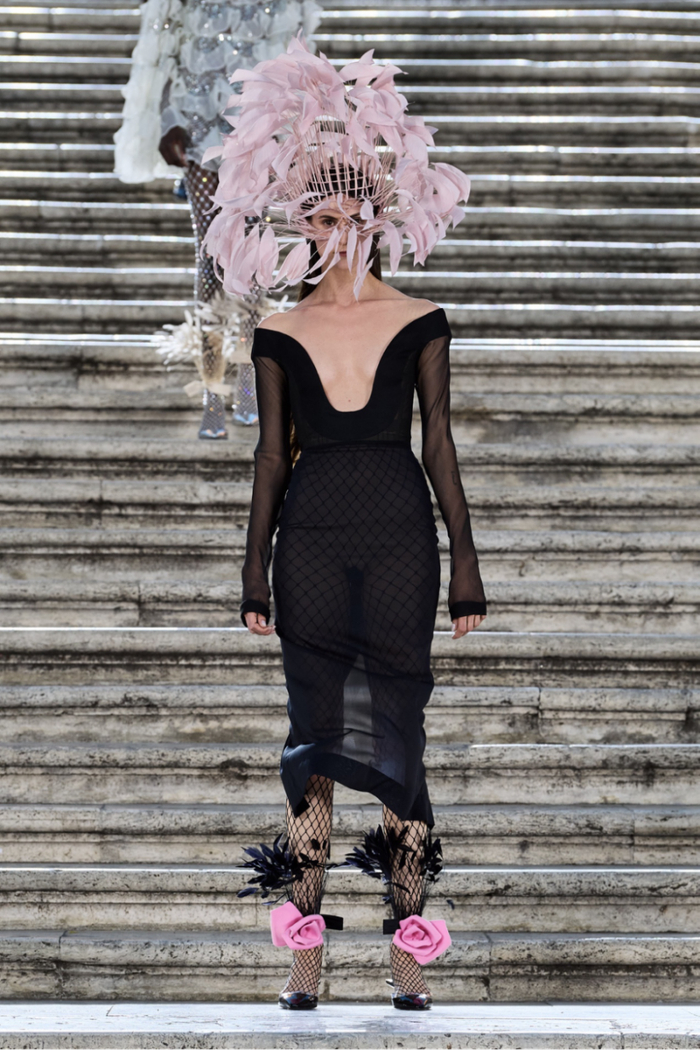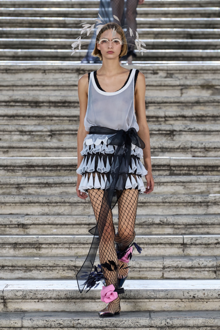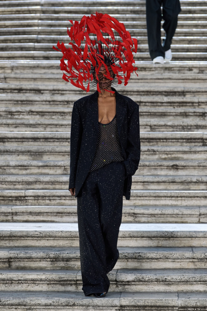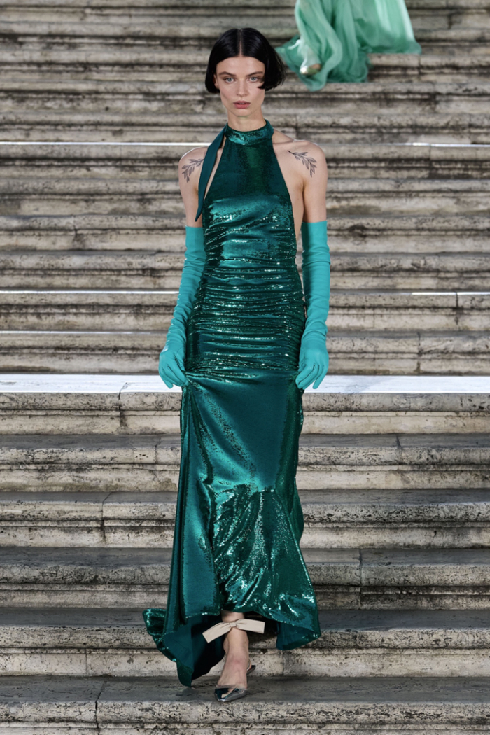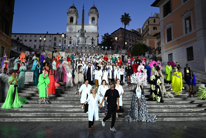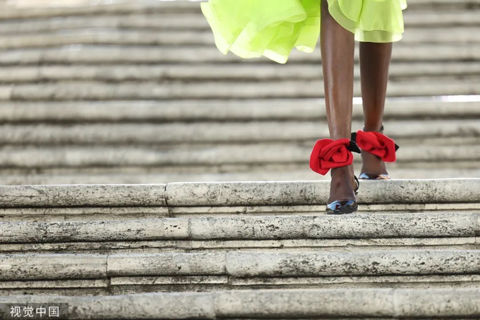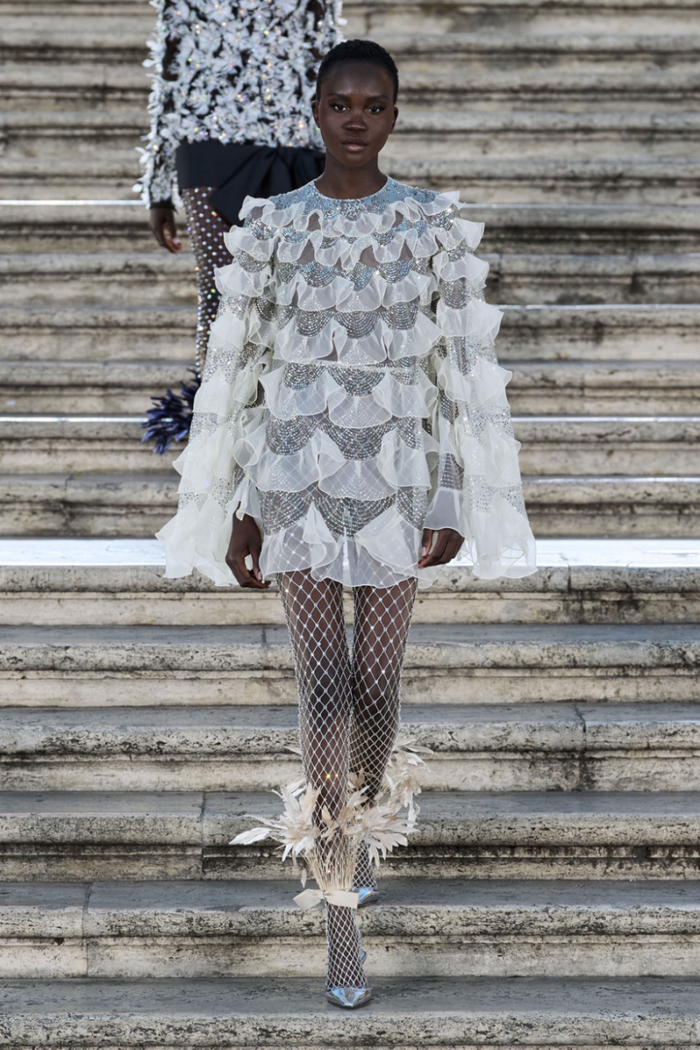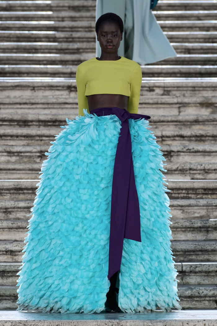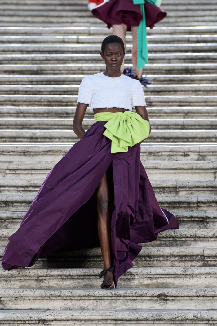 沿着西班牙广场具有历史感的楼梯,时代的步伐与秀场的步调相呼应。这些呼应都已成为 Valentino高定工坊的延伸,对美的最终描述应该与最初的诠释相仿,而非完全一致。二者之间的区别折射出对新起点的期待以及对未来旅程的憧憬。