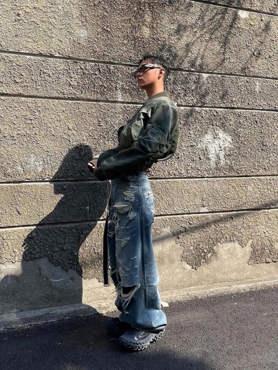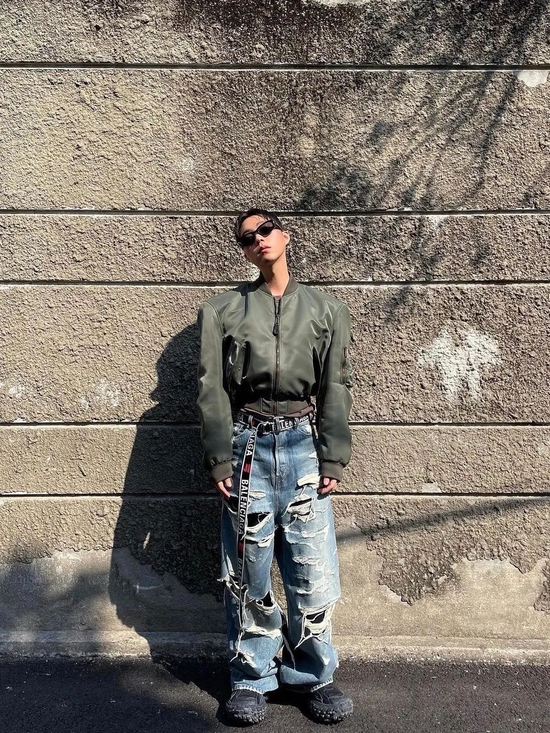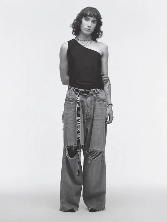 在 Justin Bieber 为 Balenciaga 2022 春夏拍摄的首支 Campaign 中,那套紧身上装搭配破洞牛仔裤的造型可以说是占据了不少社交媒体版面,除了体量十足的 Defender Sneaker,长度将近及地的腰带亦尤为吸睛。
