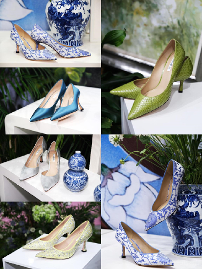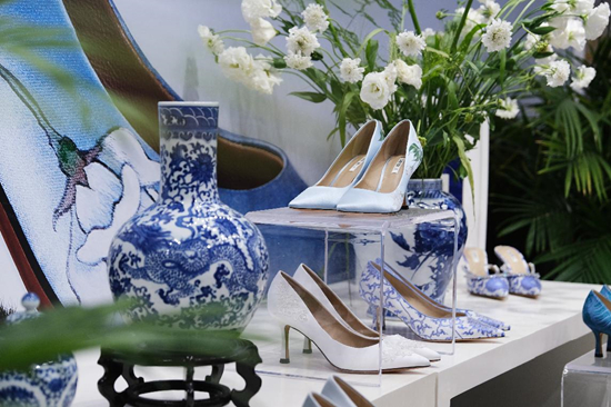 素胚勾勒、青瓷烟雨,巨大的国风主打氛围图成为吸睛亮点;步入其中,‘国风盛行’系列鞋履如艺术珍品一般有序陈列,灯光洒下,宋锦、织锦、真丝以及多种稀有皮料锻造的鞋面熠熠生光,蕴含着国风基因的多色、花面鞋履,成为展览区域的瞩目焦点。