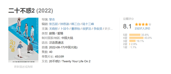 截至目前,《二十不惑2》不仅在豆瓣已斩获8.1的好成绩,还成了都市剧口碑TOP 1。