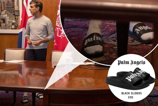 此外,还有这双来自Palm Angels的拖鞋。在去年的10月底,苏纳克穿这双价值95英镑的Palm Angels拖鞋和袜子出席了一场为预算日做准备的会议。