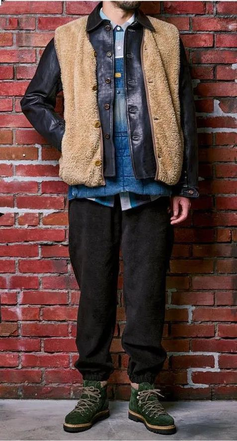 在皮衣外面穿一件马甲或者长款外套,皮革和棉质、毛质融合在一起居然有一种全新的穿搭体验!