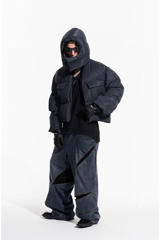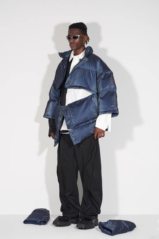 整身不规则不对称的打褶设计可以为男孩子们修饰各种身材,视觉上没有花哨多余的装饰,只有胸前的双大口袋设计,整件大衣就是实穿且实用。帽子的设计蓬松又夸张,在一水的黑色外套里一眼就被看见,与众不同。