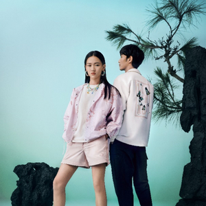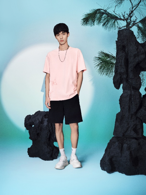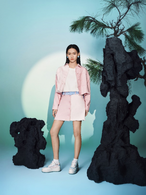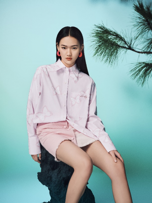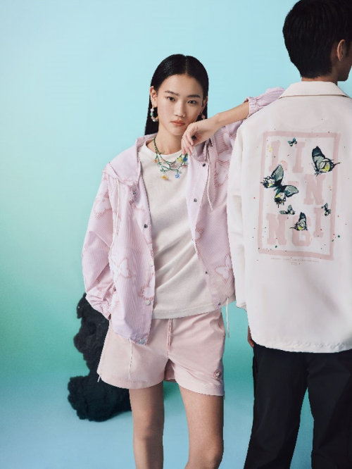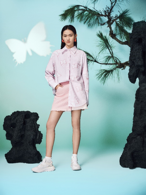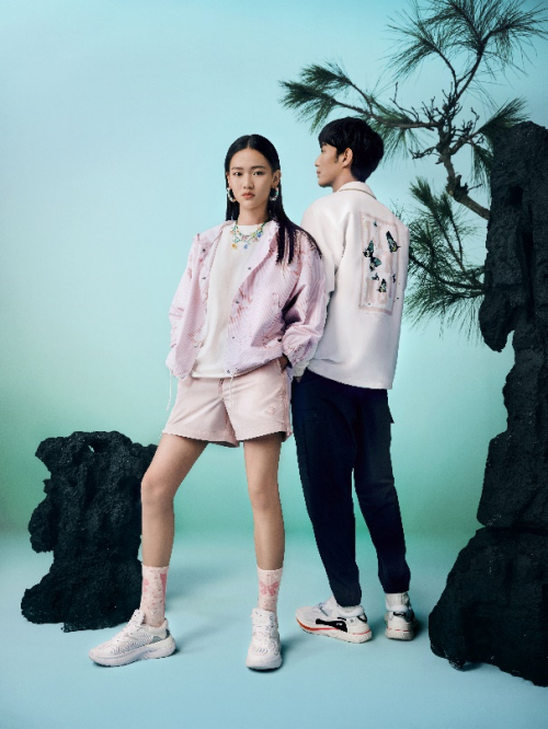 风恬日暖,彩蝶纷飞。本季主题图案将金斑喙凤蝶的灵动姿态与LI-NING品牌标识巧妙结合,以直线条的字母框架构筑有棱角的平面空间,刻画出金斑喙凤蝶标志性的金绿色斑带及细长的尾状突起,结合春夏之间特有的柔和色彩感受与轻盈舒适面料及胶浆、厚板印花、数码印花等工艺细节,让翩翩蝴蝶跃然于休闲外套、休闲衬衫、短袖文化衫等系列版型之上,将馥郁繁盛的春之气息表现得淋漓尽致。除了还原写实,设计师也期冀应用绳绣工艺,以写意的表现手法捕捉蝴蝶飞舞的灵动线条,以粗线条的极简绳绣回应繁复形态,应用于卫裤、运动长裤及牛仔等诸多单品设计呈现中,为融合自然与都市生机的百变型格提供新的注解。当飘逸蝴蝶相遇个性丹宁,硬朗与柔美碰撞,释放个性表达。水洗丹宁打造宽松版型,蝴蝶造型以绳绣工艺点缀于衣角、胸前及裤腿,尽显趣味与潮流兼备的态度。此外,本季特别推出粉色丹宁外套及短裤,灵动拼色剪裁点缀俏皮蝴蝶元素,高腰线剪裁设计配合底部毛边细节处理,尽显甜酷个性。