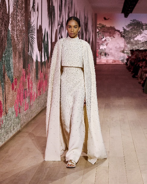 模特如圣者般排列登场,仿佛跟随着曾经统领而今依然掌管世界的神祇。垂直廓形搭配平底鞋履,以白色、米色、银色和浅金色调呈现。DIOR迪奥夹克和外套于胸部下方点缀褶裥设计,令人联想起古典雕像和立柱槽纹。象征纯洁的珍珠与银线交织缠绕,DIOR迪奥令众多刺绣图案展现流光溢彩之美。六十年代风格的闪亮纹理华丽回归,优雅装点长裙和连衣裙。羊毛和羊绒在DIOR迪奥此系列中发挥重要作用;斗篷宛如圣衣,其间或饰以刺绣,为各种造型添上点睛之笔。褶裥亦是一另大亮点,翩然跃现于男式夹克的衣袖之上。