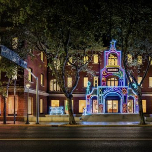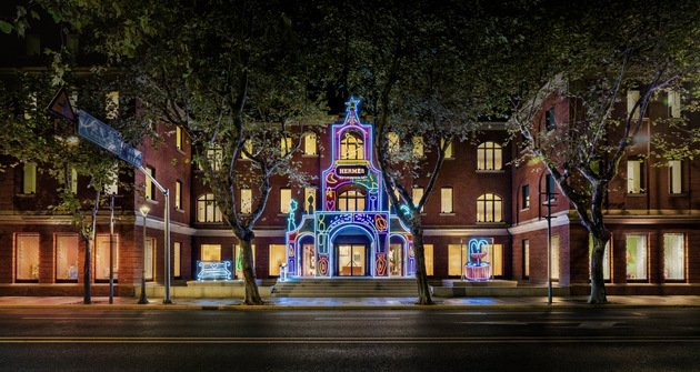 上海“ 爱马仕之家”入口处,由 Dénéréaz 创作的点灯装置以三层拱门结构重现南法钟楼,五彩光带照亮孩童涂鸦般的节日图腾。星光于顶端闪耀,金钟为冬夜报时,传递平安与祝福的回响。薰衣草随风俯首,化作迎宾拱门花廊。烛焰不灭,守望星辰之下的童话梦境。