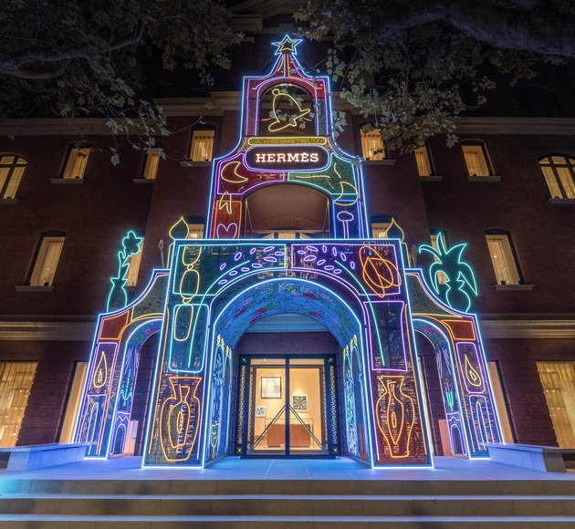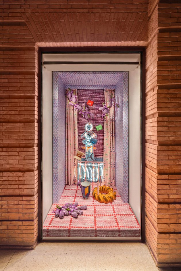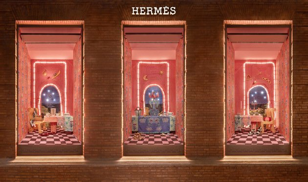 沿用源起于北非和南欧地带的中世纪布条编织技法,Dénéréaz 在其既往作品中拆解废旧布料,将之悉心重构为满载记忆和柔情的织毯。橱窗内,如壁画般延展的南法生活画卷亦模拟织毯的肌理,日常物件在五彩灯光的映照下获得新意,转化为亲密而温馨的节日注脚。丝线交织,经纬纵横,Dénéréaz 的创作是一条跨越时间与地域的丝路,串联起品牌丝巾制作传统,展现了以艺术美学承续文化脉络的爱马仕精神。