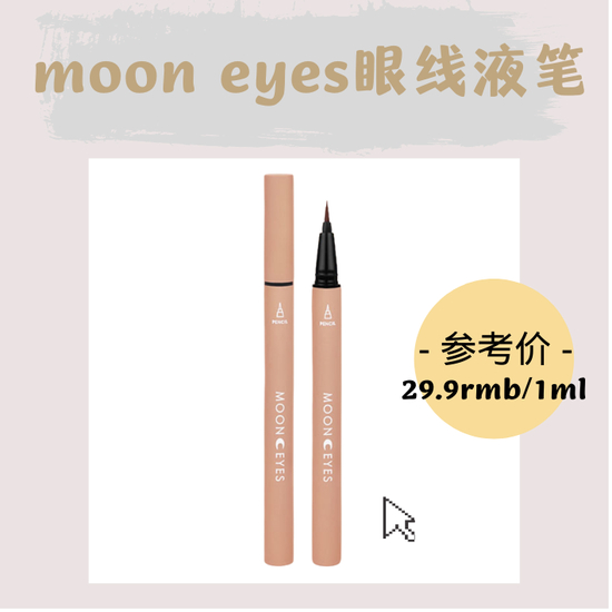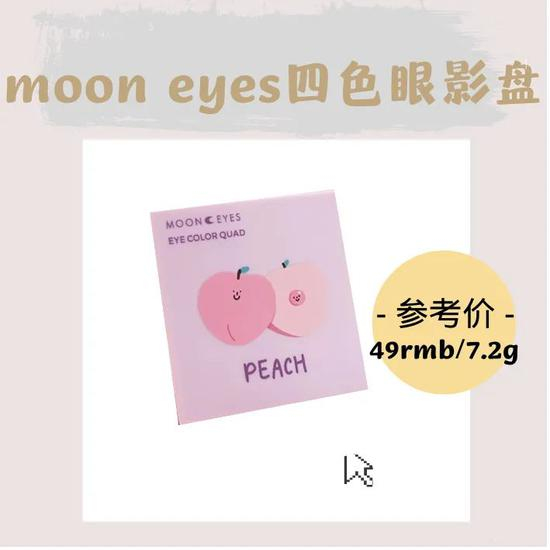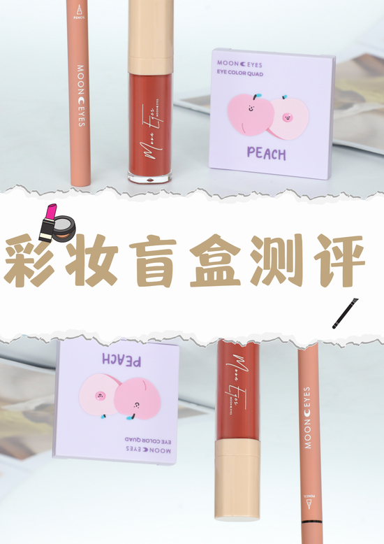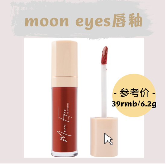 *从左至右的顺序:moon eyes眼线液笔#肉桂茶、moon eyes花间酒镜面唇釉、moon eyes大果子四色眼影盘#蜜桃